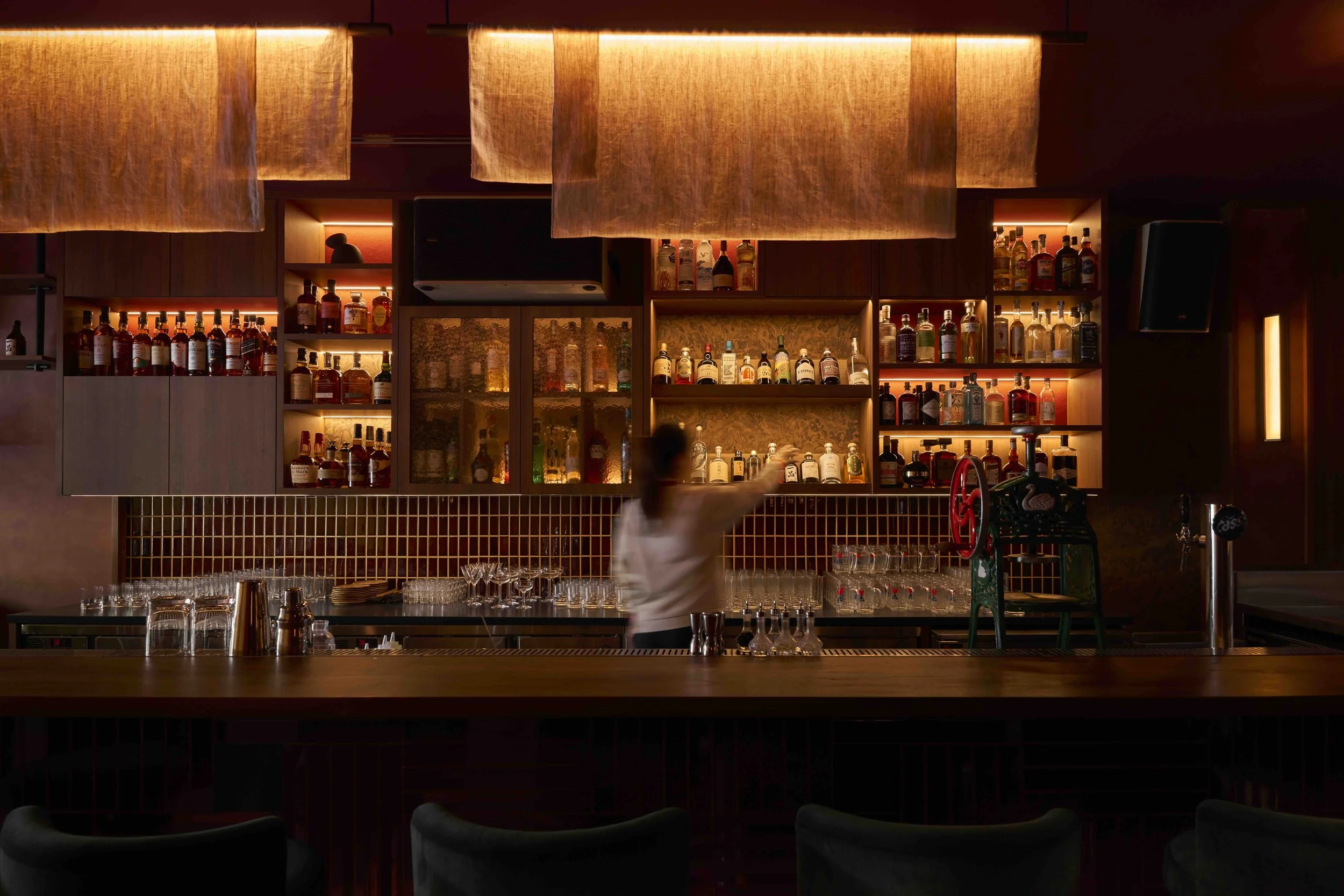 Lighting is warm and soft to create an inviting yet intimate atmosphere, with traditional paper made from mulberry bark acting as lighting diffusers in the custom wall and ceiling lamps. The linen drapes of the pendant lamps at the main bar, textile upholstery, wall treatments, and spatial zoning manage both atmospherics and acoustics, allowing the bar to feel lively without overwhelming conversation. The design adapts fluidly from early evening to late night, supporting both drink-led and food-led experiences without requiring drastic operational adjustment.